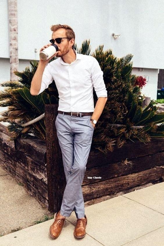 Light Blue Shirt Grey Pants Brown Shoes
